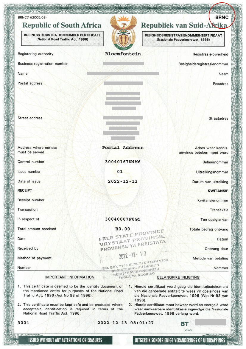 A proxy must be nominated to act on behalf of a business or non-legal person (such as trust). A copy of this person's ID must accompany the BRNC or RNC with all vehicle-related transactions such as a yearly renewal or transfer of ownership. The name and ID number of this person is added to the eNatis system.